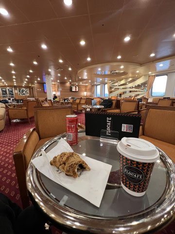 Die Fähre nun deutlich leerer, zugestiegen ist niemand, aber viele sind von Bord. Ich gehe wieder rein, arbeite noch etwas, dann ist der Akku des Laptops alle und ich hab kein Ladegerät dabei. Liegt im Roadbär X. Blöd. Und meine 27.000 MAH Powerbank ist letzte Nacht schon drauf gegangen. Hat das Mac Book ca. 75% geladen. Dann war Ende.