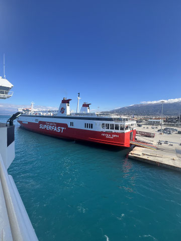 Um 13 Uhr erreichen wir bei Sonnenschein und pünktlich Patras. Legen an, und die LKW verlassen das Boot. Ich muss ne Weile warten bis alle weg sind und ich zum Van kann. Schließlich verlasse ich als letzter unser Deck. Hallo Griechenland. Freut mich, empfängst du uns mit schönem Wetter. Danke dafür.