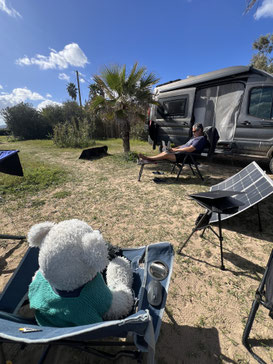 Der Morgen läuft entspannt. Sonne und Wind begleiten uns. Tino fällt irgendwann aus seinem Bus. Wir wollen heute weiter. Aber irgendwie kommt keine Dynamik auf. Und das, obwohl Co-Pilot und Frieder bereits vorne im Cockpit sitzen und der Van fahrbereit ist. Nur noch die Solartasche muss rein und wir können los.