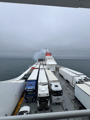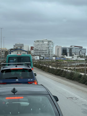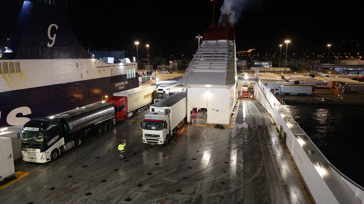 Bis wir mal vom Hafengelände runter sind, vergehen nochmal 40 Minuten. Wir stehen ewig in der Schlange der LKWs, die alle noch ne Grenzabwicklung brauchen. Unglaublich! Da wundert mich echt gar nix mehr. Wie die hier arbeiten und organisiert sind...dass die Südländer noch nicht ausgestorben sind, ist ja schon fast ein Wunder...