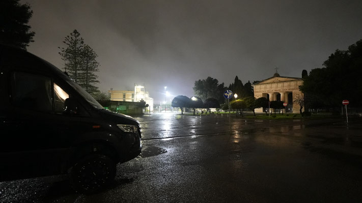So rollen wir die 120 km bis Lecce vor uns hin. Das Tageslicht schwindet, es wird dunkel und der Regen weniger. Kurz vor Lecce ist es trocken und Nacht. Die Müdigkeit kam bei mir zum Glück nicht wieder, daher ziehen wir es nun auch durch und fahren bis Downtown Lecce.