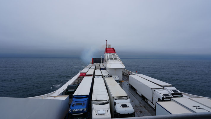 Um 9:30 Uhr packe ich meinen Krempel und geh an Deck. Raus an die frische Luft. In Igoumenitsa einiges an Volk dazu gekommen letzt Nacht. Der Kahn gut gefüllt mit Menschen. Daher bleibe ich auch lieber draußen. Setze mich an einen windgeschützten Ort, surfe im Netz und schaue auf das graue Wetter. Kurz macht es zwar mal auf, aber mehrheitlich ist es bedeckt und grau und nicht warm. Gut hab ich meine Winterjacke an.