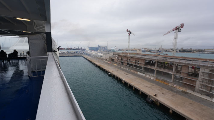 Die nächsten 20 Minuten passiert nix. Ich packe meinen Schiffsrucksack aus, hole mir ein paar Bonbons nach vorne...Frühstück und Mittagessen heute. Für mehr ist momentan keine Zeit. Um 12 Uhr kommt Bewegung in uns, wir können eine Rampe hoch und raus an Land. Hallo Italien, letztes mal hast du mir besser gefallen, sage ich...als es gerade zu tröpfeln beginnt. WTF....das Wetter ist hier echt kaputt!