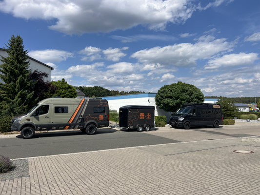 Doch ist nicht: Moin und los....kurzer Blick in die Firma und weil Niko pinkeln muss....sehen wir kurz darauf auch den Sprinter von Mona und Niko samt zugehörigem Anhänger. Wow....geil geworden....tolles Design, wirkt mit dem Anhänger wie aus einem Guss. Top verarbeitet, die Folie ohne jegliche Fehler verklebt. Sieht hochwertig und edel aus. Lars und seine Leute können definitiv was. Falls ich mal Beklebung benötige, hab ich nun eine gute Adresse!