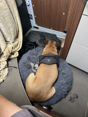 als ich aufwache ist es draußen trocken. Mona und Niko schon da. Und irgendwann ruft es um 8:30 Uhr, ich habe gerade mein hinteres Heki zum Lüften geöffnet, dass Dachträger angeliefert werden. Also raus aus den Federn und...huch...wo ist Lena???? Ich finde sie alleine in der Dinette sitzend, am Laptop, sie schneidet vor sich hin. Wow....das nenn ich mal fleissig! Da könnten sich Co-Pi und Frieder mal ne Scheibe von abschneiden.