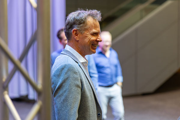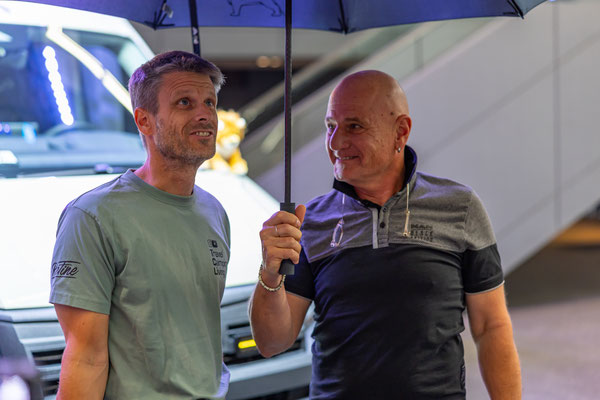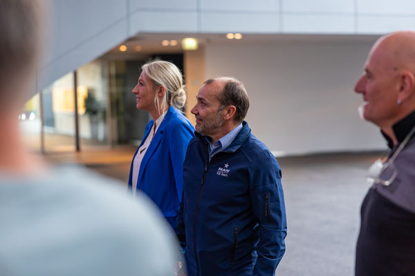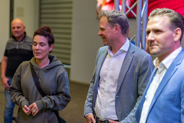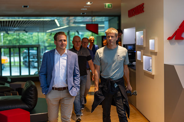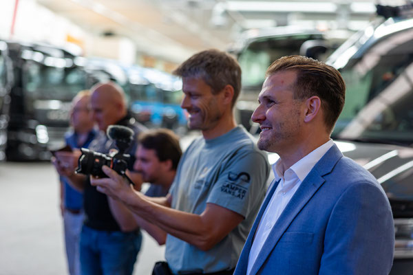 Ich hatte ihn am Morgen im Forum abgegeben, so wurde er nochmal von außen sauber gemacht und nun geht es los. Die Gruppe ist etwas größer geworden. Daniela, Thomas, Daniel, Dennis stoßen dazu...höhres Management und Chef der Dach Region. Aber...alles sowas von normale Menschen und nett. Keine Anzugträger sondern eine coole Truppe steht hier vor einem Vorhang und wartet auf die Action. Die startet dann auch sogleich....Musik, Licht, der Vorhang gleitet zur Seite und da steht er. Der KaiMAN. Obwohl schon gesehen und gefahren ist das doch ein emotionaler Moment. Bei Mona fließt ein Tränchen und auch bei mir kann ich es so gerade noch unterdrücken. Reden würde ich jetzt nicht wollen müssen.