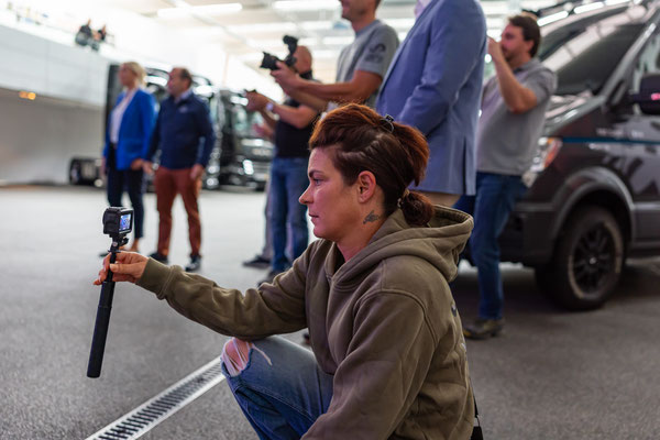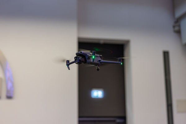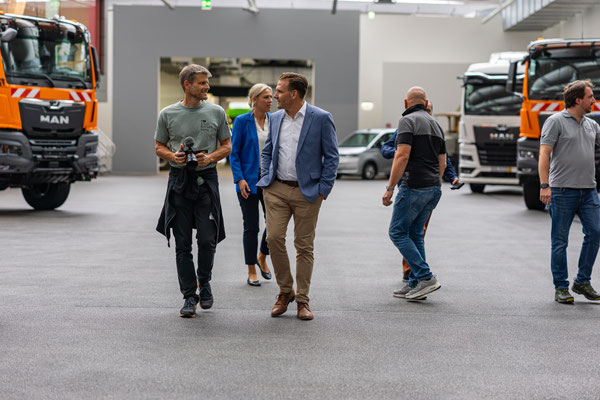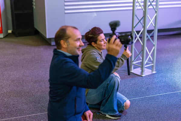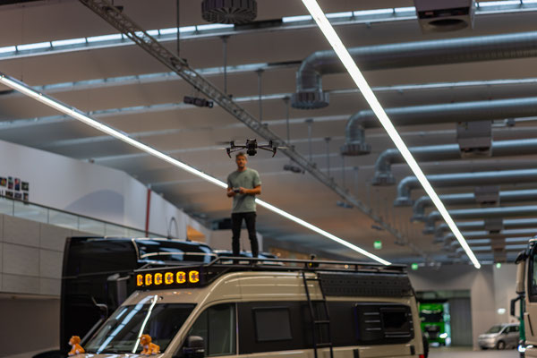 Natürlich filme ich auch noch, fliege sogar Drohne in der Halle. Mein erste Indoor Flug ever. Und das in einer Halle mit zig nagelneuen LKWs die hier zur Übergabe an glückliche Kunden bereit stehen. Ich glaub, ich bin noch nie so vorsichtig geflogen wie an diesem Tag. Doch geht alles gut, keine Probleme im Flug...uff...