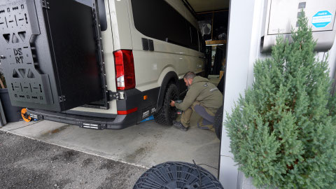 heute geht es nochmal Vollgas um den KaiMAN. Um 10 Uhr rollt er bei trübem Wetter in die Halle und Räder werden gewechselt. BF Goodrich 265/60 R18 kommen runter, General Grabber 255/55 R18 kommen drauf auf die 18" Delta Hanma Felgen. Mit diesen haben wir beim MFK keine Probleme mit der Tachoabweichung. Daher der Wechsel und wir wollen sehen, ob die kleineren Reifen einen Einfluss auf den FRONT ASSIST Fehler haben.