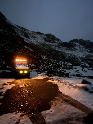 Oben am Pass durch den Tunnel und dann rechts auf den Parkplatz. Ein VW XY steht dort, etwas Schnee liegt rum, da fahren wir natürlich durch, 3.5°C. Schade...hatte auf Frost gehofft.