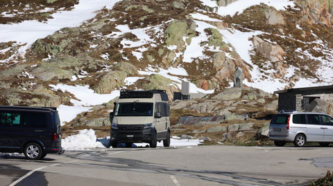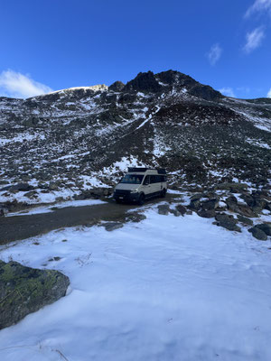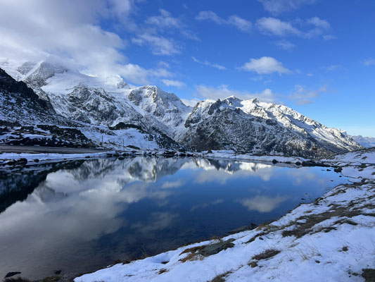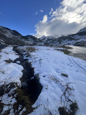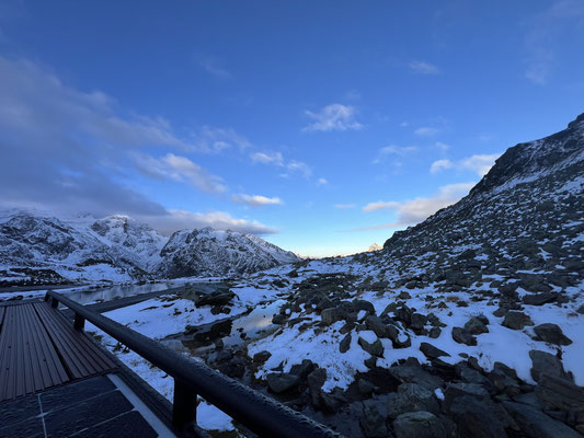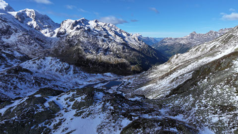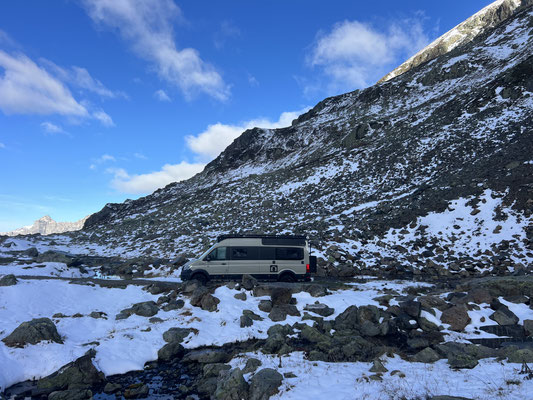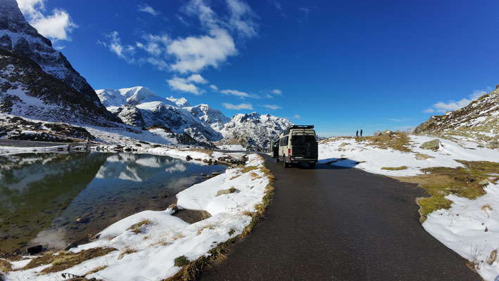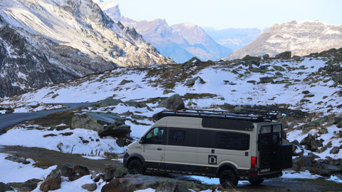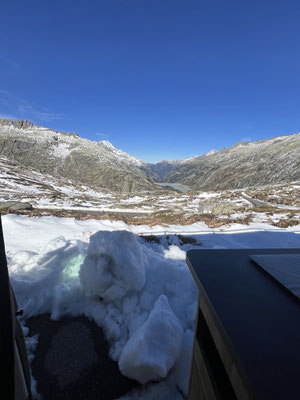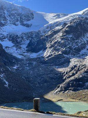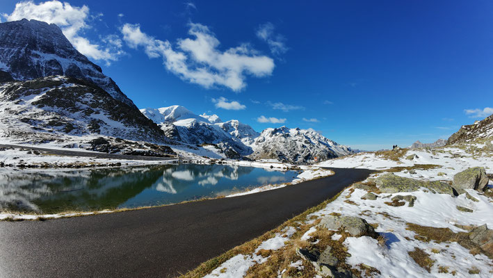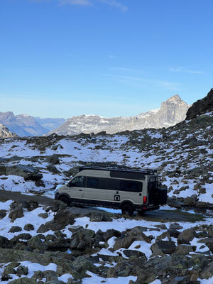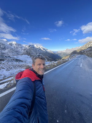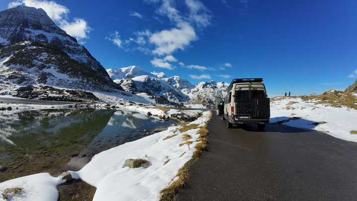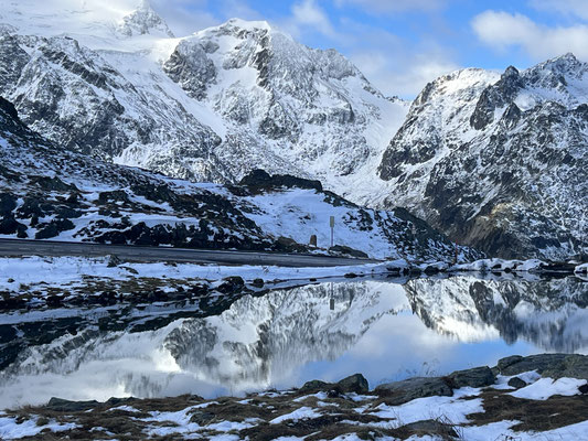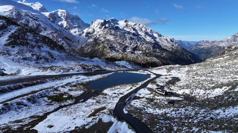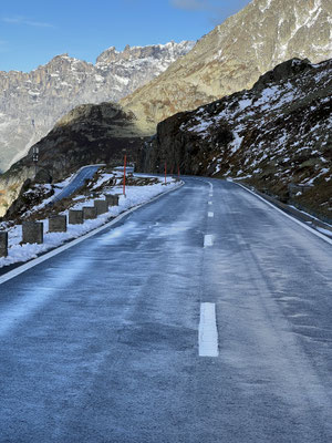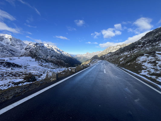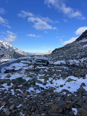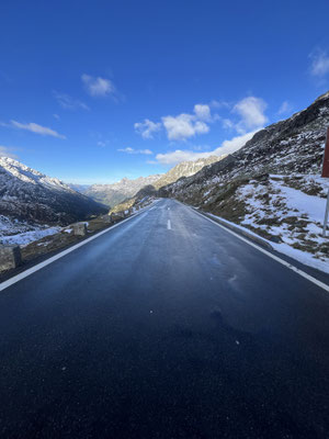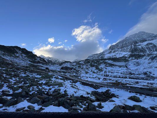 Vor der Tür...frisch...aber weiter kein Frost. Schnee liegt etwas. Es sieht nach spätem Herbst und frühem Winter aus. Herrlich. Dazu immer mehr Sonne. Ich drehe eine kleine Runde. Kaum was los hier oben. Während im Sommer mit dem Sonnenlicht die Fahrzeuge hier über den Pass donnern, ist es im Herbst schön ruhig. Ende September, Anfang Oktober eine Gute Zeit, die Alpen in Ruhe zu genießen. Vor allem unter der Woche!