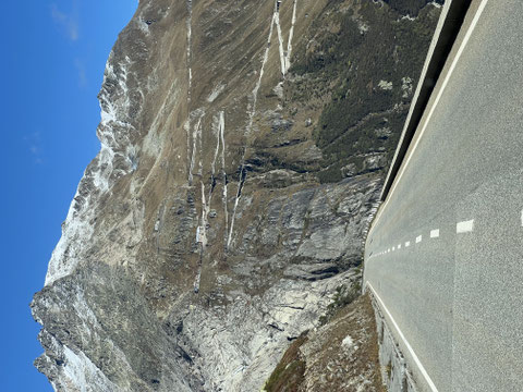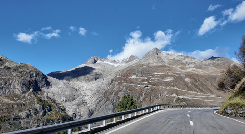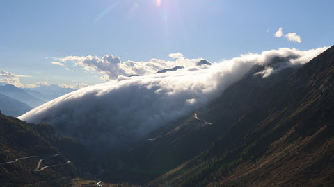 Wir fahren bei sonnigem Wetter bis auf den Furkapass. Kaum Verkehr. Macht Spaß. Die Wolken drücken über Grimsel und Furka rüber ins Wallis. Toller Wolkenflow. Oben auf dem Furka gen Andermatt stehen wir dann voll in der Suppe. Dicker Nebel. Null Sicht. Abhänge, enge Kurven...alles nicht sichtbar. Gut läuft das Navi mit und zeigt, wann die nächste Spitzkehre kommt.