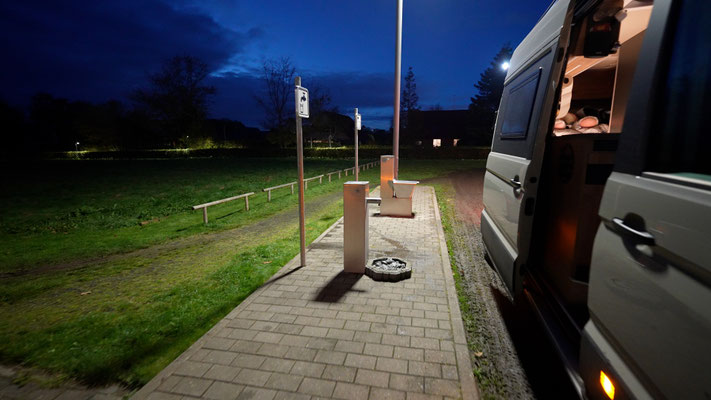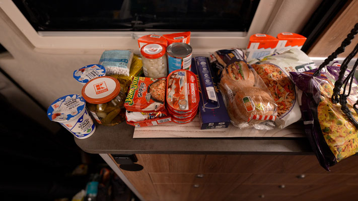 Nach diesen Wasserspielen heisst es verabschieden und abfahren. Weit kommen wir jedoch nicht: ich muss noch einkaufen. Das erledige ich im nahen Supermarkt, 160 Euro später und schon bei Dunkelheit weil gleich 19 Uhr, verräume ich alles im KaiMAN und bin froh um meinen großen Kühlschrank. Der schluckt alles. Auch alle anderen Dinge finden noch ihren Platz.