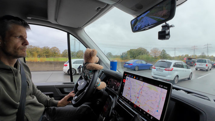 Gegen 11 Uhr verlassen wir unseren Parkplatz irgendwo bei Hannover und fahren ab. Es regnet und windet. Gruseliges Sonntagswetter. Dazu noch ne Menge Verkehr. Was war das schön letzte Nacht als wir praktisch alleine unterwegs waren.