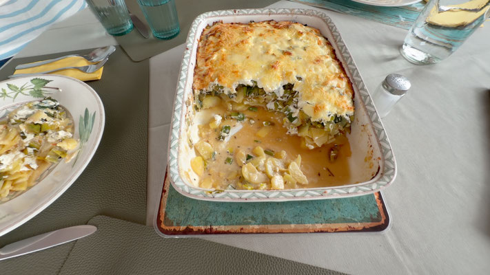 Im Anschluss muss ich kurz an den Rechner, Waschmaschine anstellen, duschen, wieder arbeiten und um 13 Uhr gibt es Lauch-Kartoffelauflauf. Lecker!