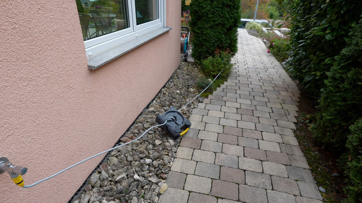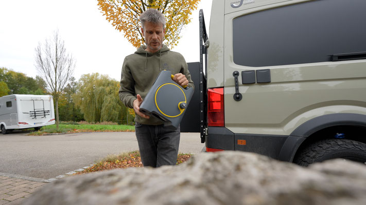 Nach dem Vergnügen wieder Arbeit. Wasser muss noch in den Frischwassertank. Gestern bei Mona und Niko und Timo vergessen. Also jetzt. Timo hatte mir da gestern auch noch ein lustiges Tool mitgegeben. AquaFlow 10, 10 m Schlauch kompakt verräumt und aufgewickelt. Eine kleine, tragbare Box mit Magneten dran um sie bei der Befüllung am Auto zu befestigen. Leider....reicht der Schlauch bei mir nicht. Ich müsste 20 m haben. Dennoch nutze ich die Box plus meinen eigenen 5 m Schlauch und muss so deutlich weniger laufen und die schwere Wasserkanne schleppen.