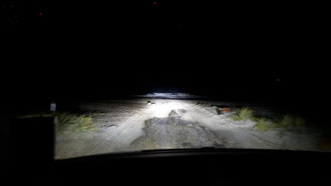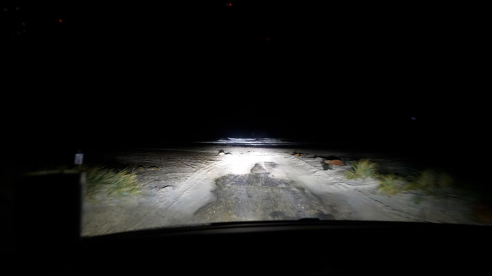 Ein mittelgroßer Asphaltparkplatz in den Dünen. Niemand hier. Stockdunkel. Kein Licht. Mittlerweile 23 Uhr. Die Straße führt noch weiter. An den Strand. Ich fahre bis vor und sehe schon recht bald das Meer. Wind und Flut, der Strandstreifen hier nicht breit, aber Fahrspuren im Sand. Man darf hier fahren aber nicht Campen oder Zelten, sagt ein Schild. Hallo Meer! Hallo Nordsee! Da sind wir. Es regnet.