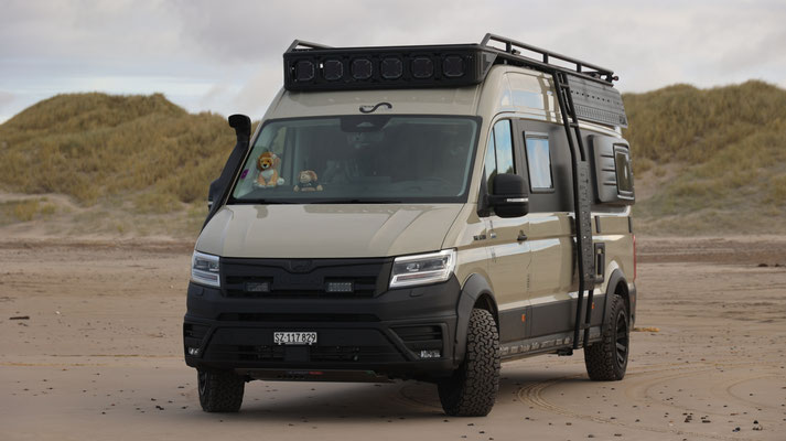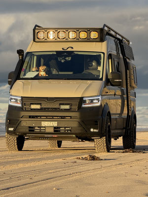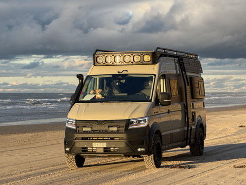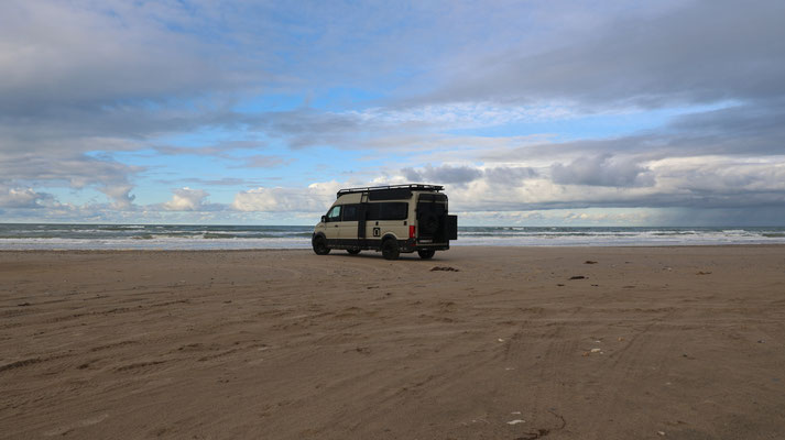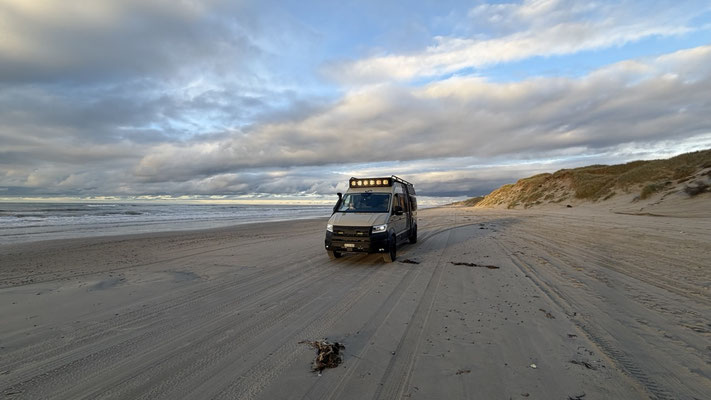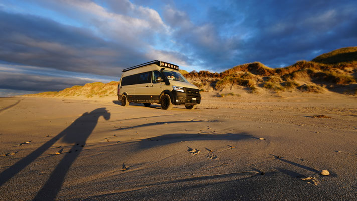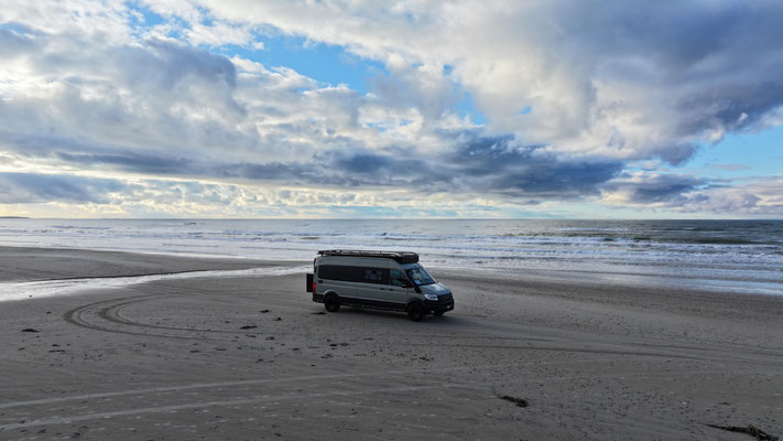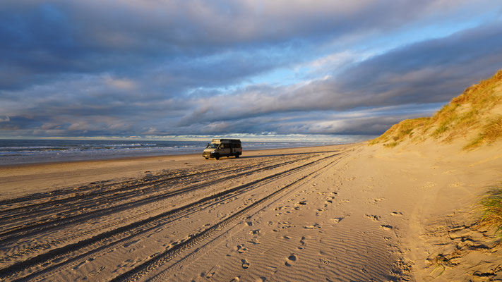 Rund 20 km düsen wir am Strand. Mal gen Nord, mal gen Süd. Hier und da auch etwas loser Sand. Aber nichts, was den KaiMAN in irgendeiner Art und Weise fordert. Ich grinse, der Co-Pilot grinst, Lena grinst....was ein geiler Tag. Gegen 17 Uhr kommt die Sonne nochmal tief rein. Golden Hour. Und was für ein Gold. Grandios! Viel geiler geht nicht!