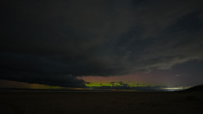 Ich hole mein Stativ raus, gehe in den manuellen Modus der Kamera, mache meine Einstellungen und belichte 8 Sekunden. Zack....grün! Weit hinten am Horizont. Nun scharf und in zeigbarer Qualität. Ich checke meine Polarlichtapp: japp, ordentliche Intensität am Himmel. Bis weit runter. Somit eine gesicherte Aussage: Das sind unsere ersten Polarlichter auf dieser Tour. Am Strand von Dänemark. Damit hätte ich jetzt nicht gerechnet. Gute Start in die Polarlichtjagd. Geil!