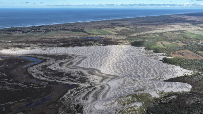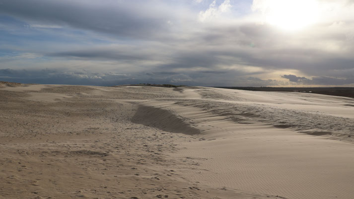 Somit fliegt er eine ausgedehnte Runde. Gar ich tso einfach diesen 1 x 1 km grossen Sandhaufen aufs Bild zu bekommen. Sieht aus der Luft wie Schnee und Eis aus. Ist aber feinster Sand der sich mit 15 m im Jahr gen Nordosten bewegt. In 100 bis 200 Jahren soll er die Ostsee erreichen und dann dort verschwinden. Momentan frisst sich die Düne gerade durch einen Wald. Sie zu stoppen brachte keinen Erfolg.