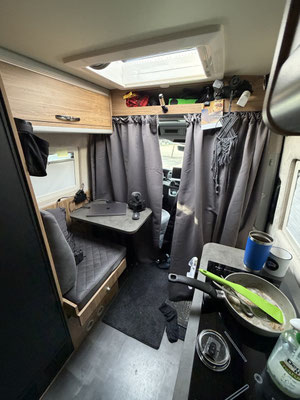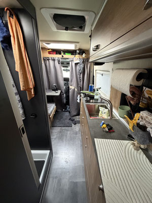 Ich schaue nochmal nach hinten Richtung Dinette, lasse den Blick über die Küchenzeile schweifen...Blicke hoch zu den Hängeschränken....BINGO....das seh ich ihn. Er schaut schüchtern aus der kleinen STYYL Tasche raus die dort magnetisch über dem Kochfeld schwebt. Ja...ich erinnere mich, dort verstaute ich ihn. Liess ihn extra etwas rausschauen um ihn besser zu sehen und zu finden...und merkte mir, dass ich ihn dort hin tat. Hat ja mal wieder super funktioniert! Oh man...Erleichterung durchströmt mich. Ich schnappe mir das Ding, setze mich wieder neben den Co-Pilot und fahre an. Ab zum Gate. Friedrich schaut grimmig.
