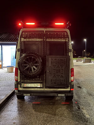 Mittlerweile regnet es schlank runter und um 17:30 Uhr laufe ich runter auf Deck 3A zum KaiMAN. Der steht noch dort, wo ich ihn zurück gelassen hatte. Der Co-Pilot liegt hinten mit Lena und einer Flasche Whisky im Bett. Unglaublich die beiden!!!