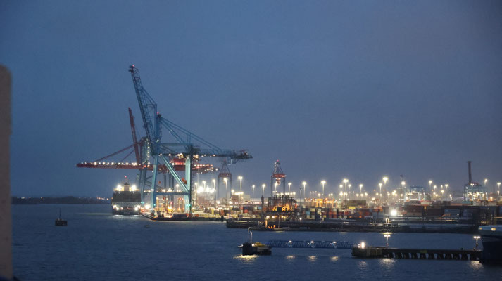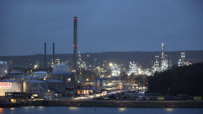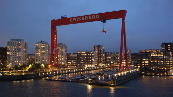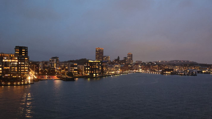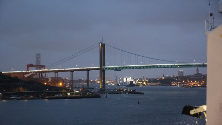 Die Fahrt verläuft ruhig, ich sitze und arbeite nach dem Telefonat weiter. Bis 17 Uhr. Es dämmert leicht. Das Wetter nun bewölkt mit leichtem Nieselregen und Land ist in Sicht. Die Schären vor Göteborg durchkreuzen wir. Die Stadt leuchtet uns den Weg, vorbei geht es am Containerterminal das leuchtet wie ein Weihnachtsbaum, danach unter einer schicken Brücke durch und an einem Wohngebiet vorbei, das noch recht neu scheint und teuer aussieht. Ein ganz neuer Stadtteil entstand dort an der Einfahrt nach Göteborg. Schaut schön aus bei Dunkelheit.