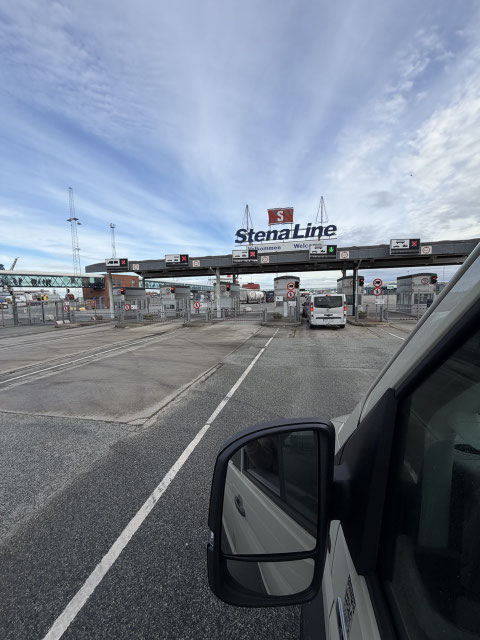 Als erstes borded alles um uns rum das Schiff. Die LKWs geben die Sicht frei und fahren auf den STENA LINE Dampfer. Als lezte darf dann Lane 5 los und vorne ins Schiff rein. Sie quetschen uns hinter die ganze LKW auf Deck 3A blau. MERKEN!!!!!