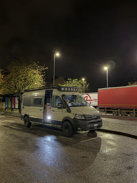 Und jetzt? Wieder zurück? Nee..zu den 4 anderen stellen wir uns nicht, dass sah so schon zu voll aus. Ich schaue auf Google Maps...finde einen P+R Parkplatz an der Autobahnausfahrt von vorhin und fahre die 8 km wieder zurück. Parkplatz passt, eigentlich nur für PKW, aber sind wir ja auch fast. Rückwärts drauf, Hinterachse im Gras. Angekommen.