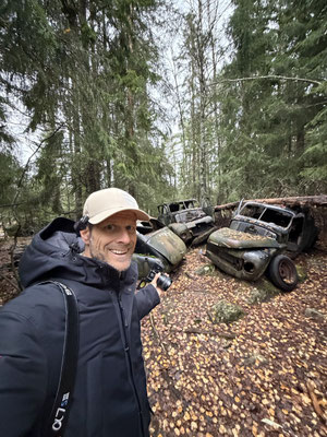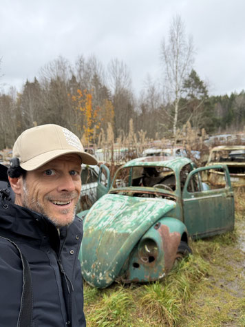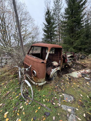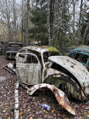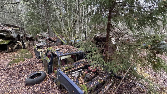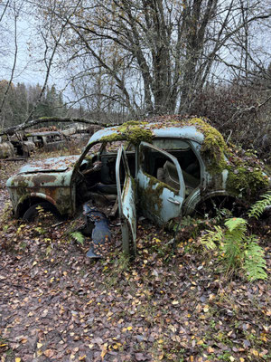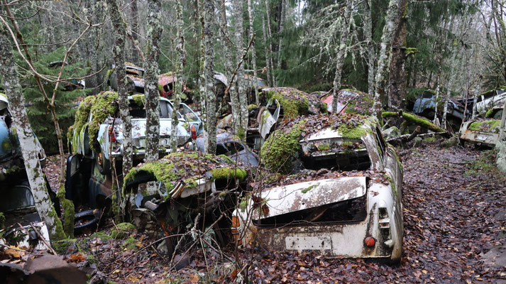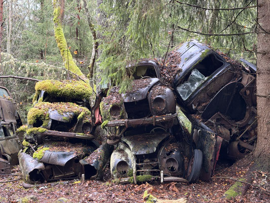 Schwedische Brüder hatten hier seit der fünfziger Jahre ein Autoverwertungsunternehmen. Sie zerlegten Fahrzeuge und verkaufen die Einzelteile zollfrei nach Norwegen. Dort herrschten bis in die 70er Jahr hohe Zölle auf ganze Autos. Ein lukratisves Business, bis Norwegen die Zollpolitik änderte und die Zölle reduzierte. Damit begann der Untergang und in den 80er Jahren verlor das Unternehmen der Brüder ihre Lizenz für die Fahrzeugverwertung. Seither gammelt hier alles vor sich hin. Der Wald holt sich sein Land zurück. Alles ist überwuchert und ein wenig unheimlich. Die vielen leeren Scheinwerferpaare die mich anschauen während ich ab vom Schuss durch den Wald geistere. Coole Location. Besuch und Umweg lohnen sich in meinen Augen.