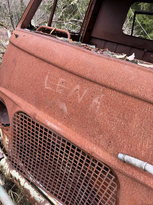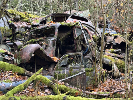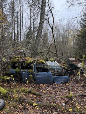 Schotterparkplatz, Toiletten, Schautafel und ne Menge alter Autos. Die nächsten 1,5 Stunden stromere ich hier über den Friedhof. Es ist nicht mehr zu erkennen, was hier alles steht. Viele Käfer erkenne ich, n Ford Transit, evtl. n VW Bus und ansonsten einfach alter Schrott. Ausgeschlachtete Fahrzeuge, gestapelt auf einander im Wald oder auf freier Fläche. Ein riesen durcheinander.