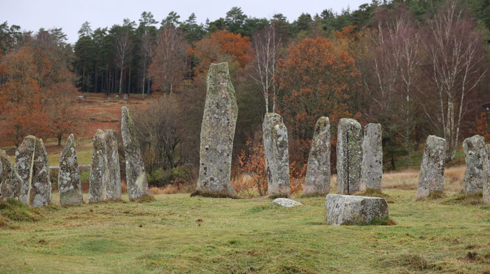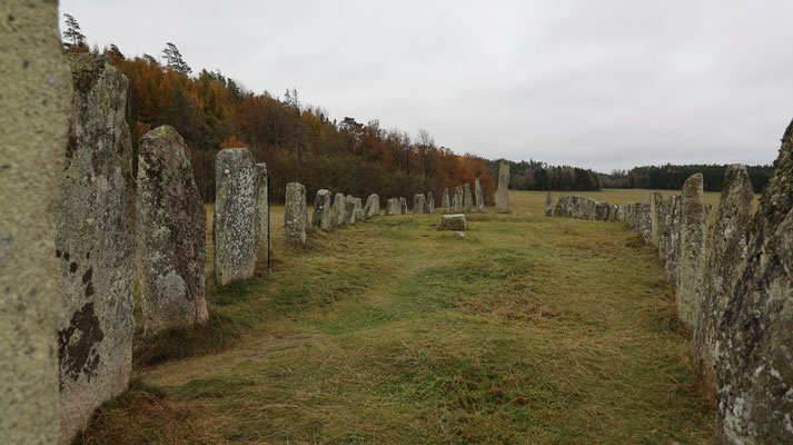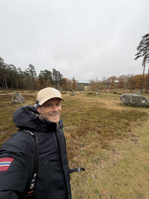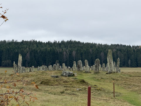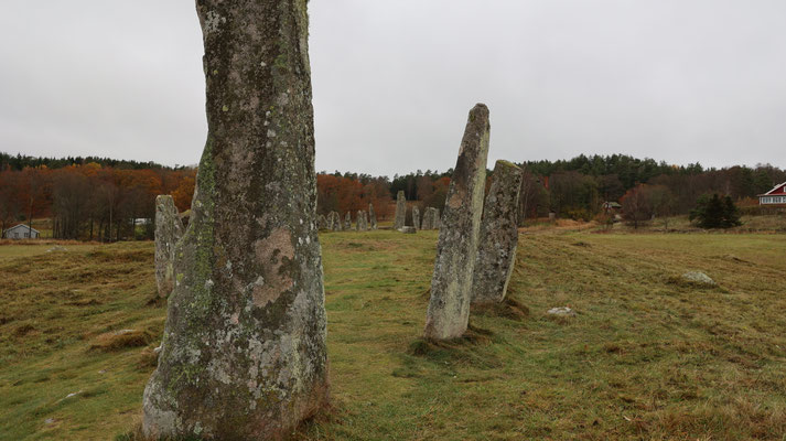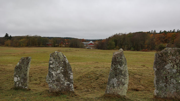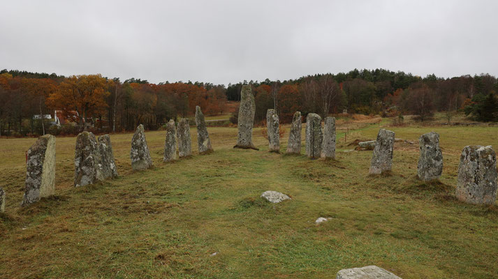 Vom Steinschiff laufe ich über Gras und etwas Matsch, gut hab ich Gummistiefel an, weiter zum Steinkreis. Vorbei an einem Haus, über einen Bach der im 17. Jahrhundert hier Sägen und Mühlen antrieb, kreuze die Straße, komm an Blomsholmer Honig vorbei und öffne ein Gatte. 5 Minuten später stehe ich am Steinkreis. Gut erhalten, 33 m im Durchmesser, in der Mitte ein Stein. All das in einem lichten Wald der herbstlich fortgeschritten ist. Ich bin alleine, blicke von hier sogar rüber auf das Steinschiff. Ein schöner morgendlicher Spaziergang, nicht mörder mitreissend, aber schön.