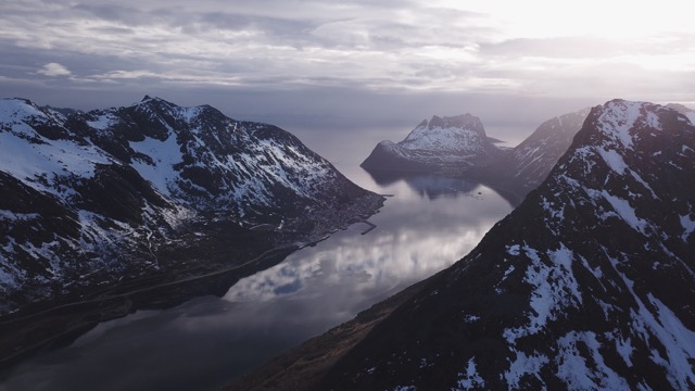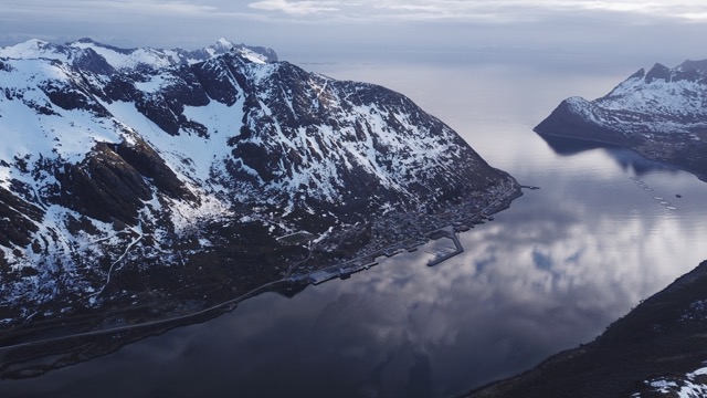 Ort verschlafen, der Hafen liegt ruhig da. Überwiegend ältere Holzgebäude stehen hier rum. Das Wetter grau, das Meer super ruhig und die Berge spiegeln sich herrlich im Fjord. Schnell noch ein